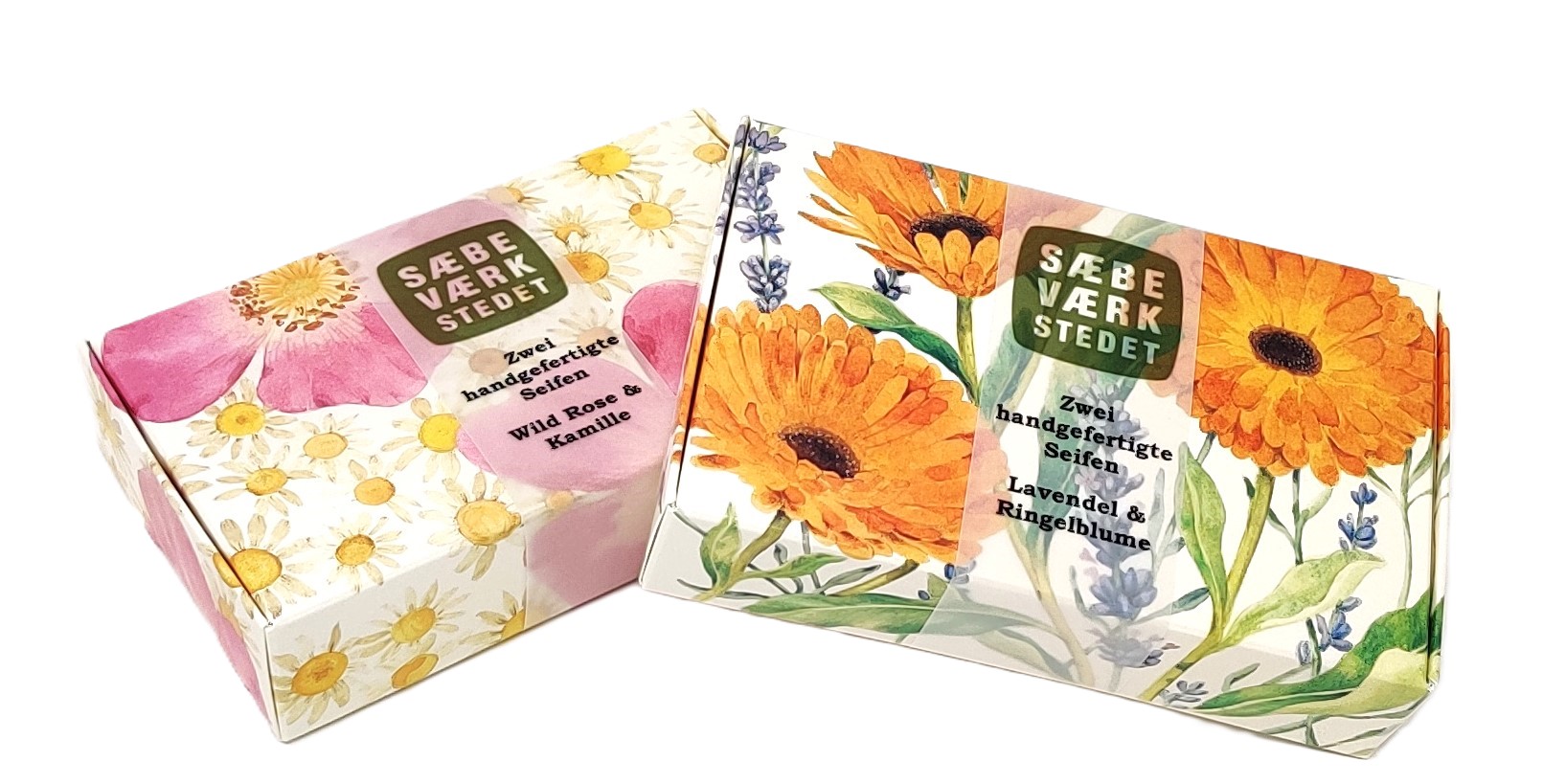 Die Boxen enthalten je zwei 100-g-Seifen. Eine mit Lavendel und Ringelblume, die andere mit Wildrose und Kamille & Lavendel. Jede Box ist nach diesen Themen illustriert.